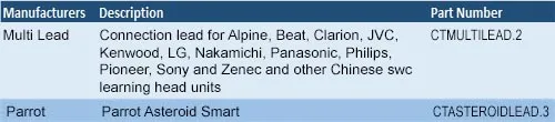 Connects2 Steering Wheel Control Interfaces allow plug and play installation of an after-market head unit into a vehicle whilst maintaining use of the steering wheel controls. Each interface is compatible with a range of patch leads which you will need to select from the add-ons section above. This patch leads connects an ALPINE, BECKER, BLAUPUNKT, CLARION, JVC, KENWOOD, PANASONIC, PIONEER, SONY, BEAT, ZENEC and Parrot (Classic and Smart) stereos.