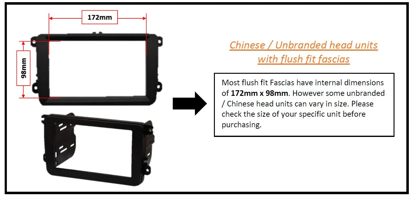 Some branded and other unbranded head units vary in size and will not fit. Please check the dimensions of your Head Unit and compare to our flush fit dimensions (172mm x 98mm). If your head unit will not fit these dimensions then we also offer 50-746M which can accommodate the larger and motorised units.