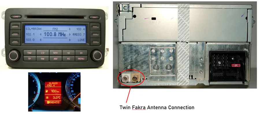 This fitting kit is compatible with Volkswagen cars fitted with original RCD300 and RCD500 head units that have a twin Fakra antenna connection, Please see pictures below.