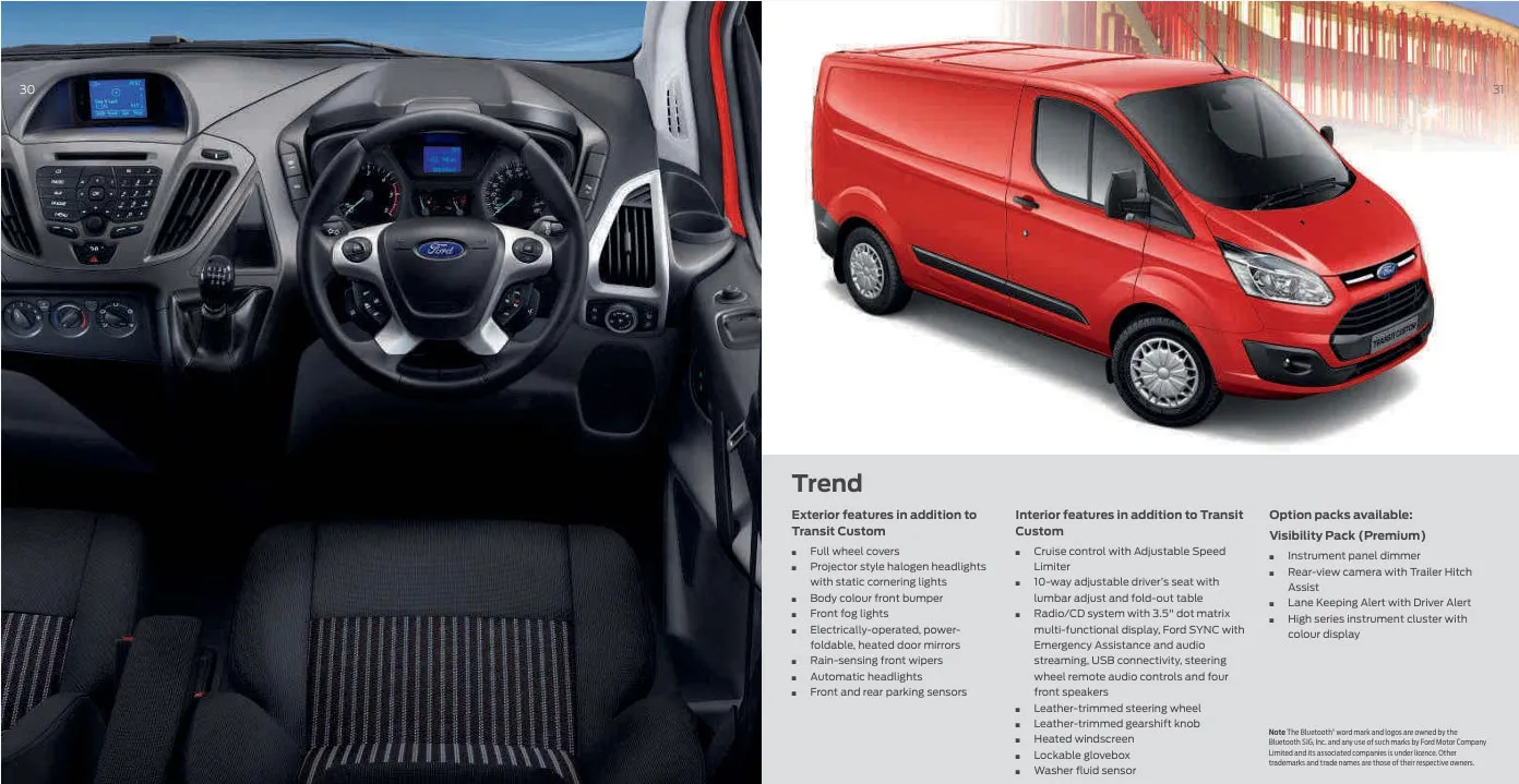 Trend models of the Ford Transit Custom come with a Radio/ CD system with 3.5" dot matrix multifunctional display, Ford SYNC with Emergency Assistance and audio streaming, USB connectivity, Steering wheel remote audio controls and four front speakers.