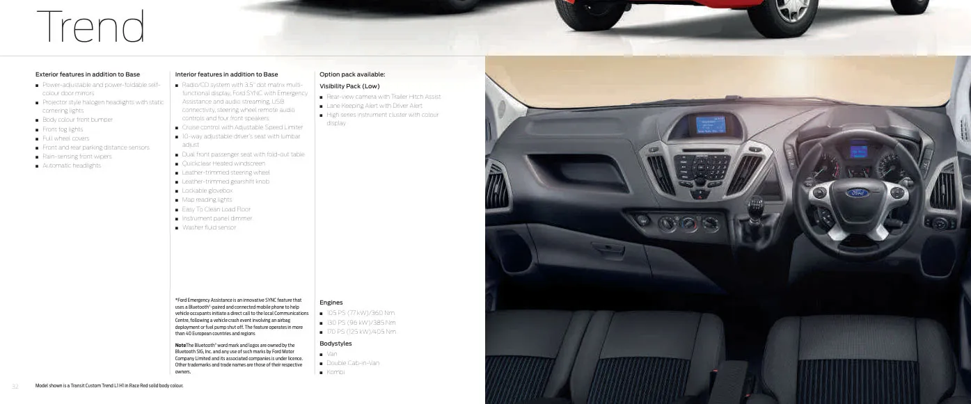Trend models of the Ford Transit Custom come with a Radio/ CD system with 3.5" dot matrix multifunctional display, Ford SYNC with Emergency Assistance and audio streaming, USB connectivity, Steering wheel remote audio controls and four front speakers.