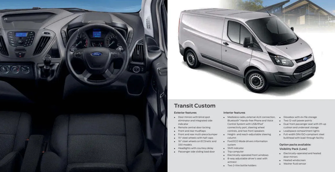 Base models of the Ford Transit Custom come with a Medialess radio which has no display on top of the central dashboard. These Medialess radio models come with an external AUX connection, Bluetooth, Hands-free phone and voice control system with USB/ Ipod connectivity port, steering wheel controls and two front speakers.