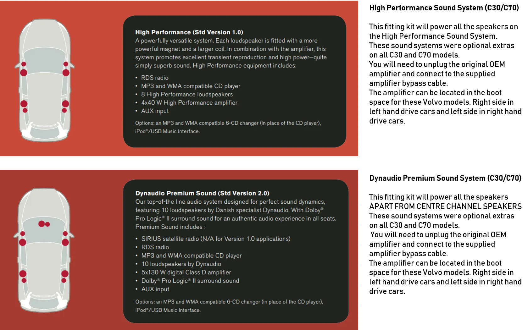 Below are some examples of the sound systems installed on C30 and C70 (2007-2013) car models.