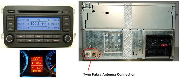 This fitting kit is compatible with Volkswagen cars fitted with original RCD300, RCD500 or RNS-MFD-2 head units that have a twin Fakra antenna connection, Please see pictures below.
