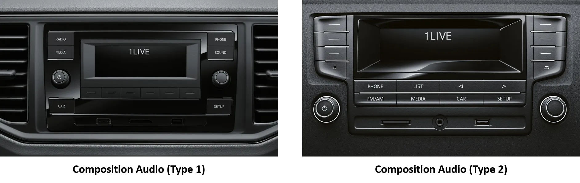Suitable for fitting Volkswagen Crafter (2017 onwards) vehicles with factory fitted composition audio (Type 1 or Type 2) head units (As Pictured Below)